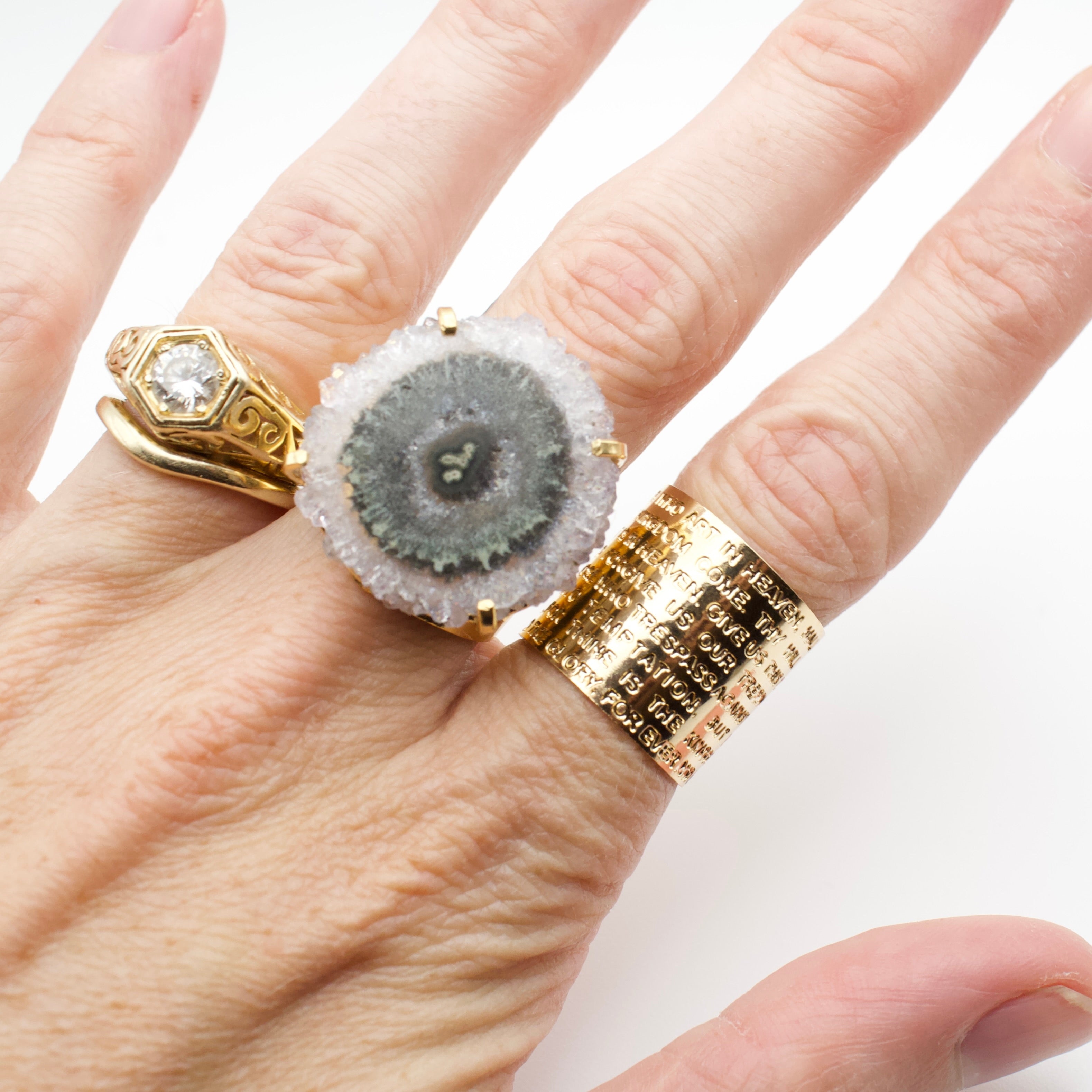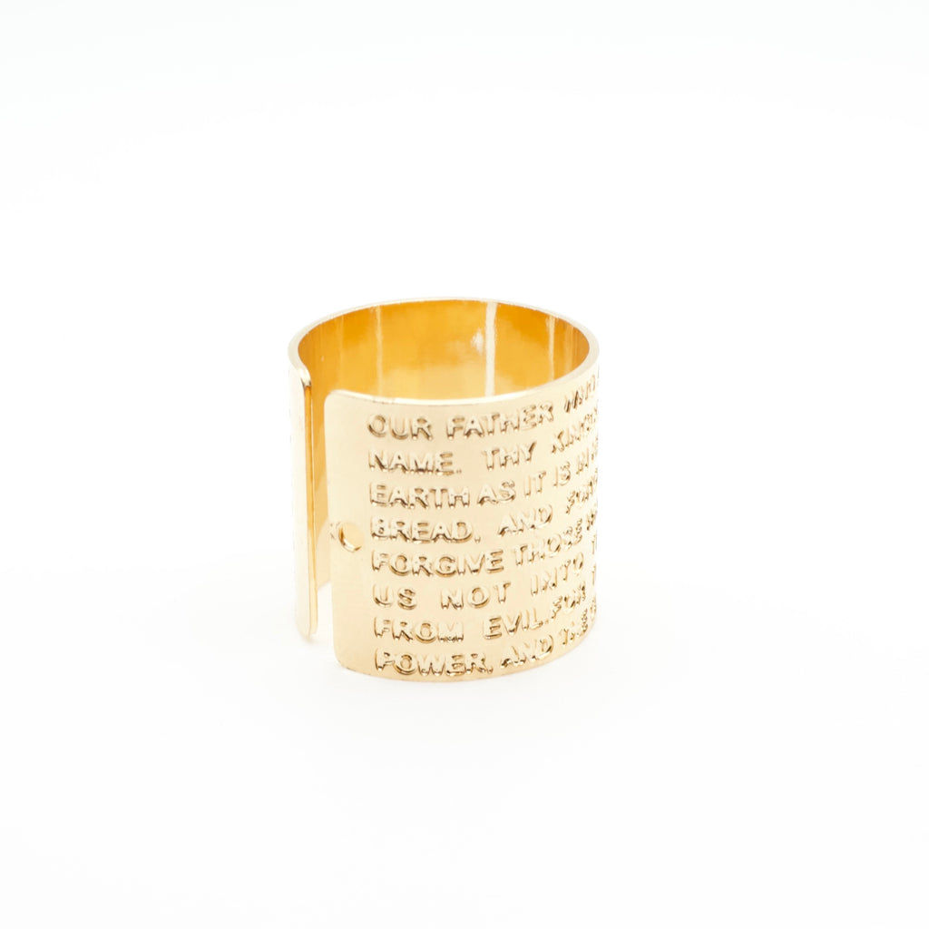 The most special ring! The entire Lord's Prayer is written out on this stylish ring. Adjustable band, so one size fits most. 18K gold-plating.